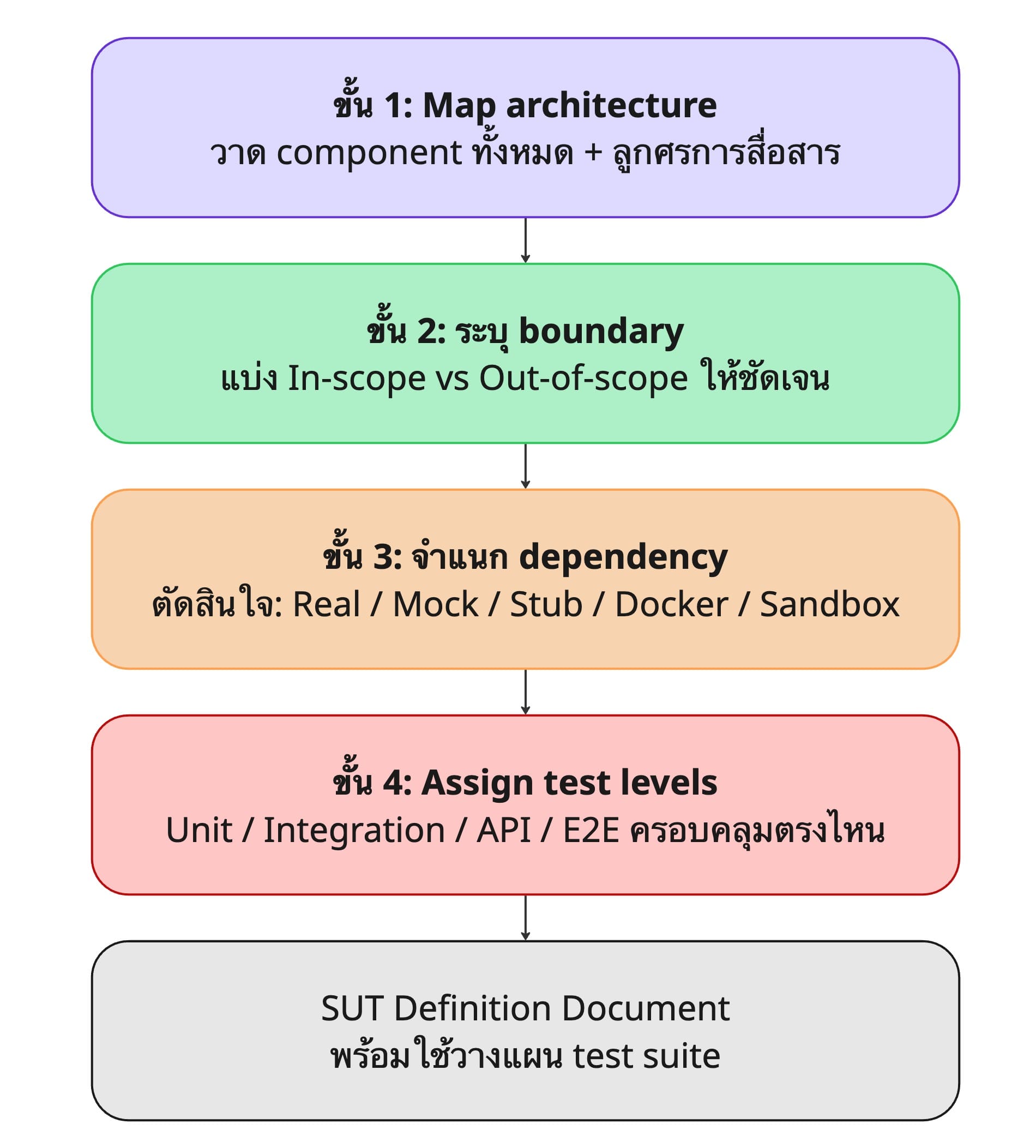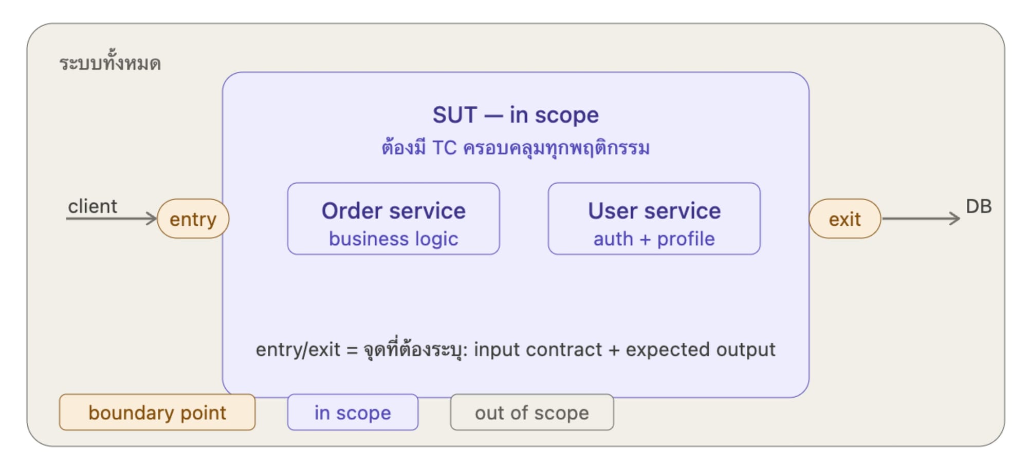 Boundary ของ SUT คือ เส้นที่ขีดรอบสิ่งที่ tester "เป็นเจ้าของ" ทุกอย่างข้างในต้องมี Test Case ครอบคลุม ทุกอย่างข้างนอกต้อง mock/stub หรือ ไม่สนใจ