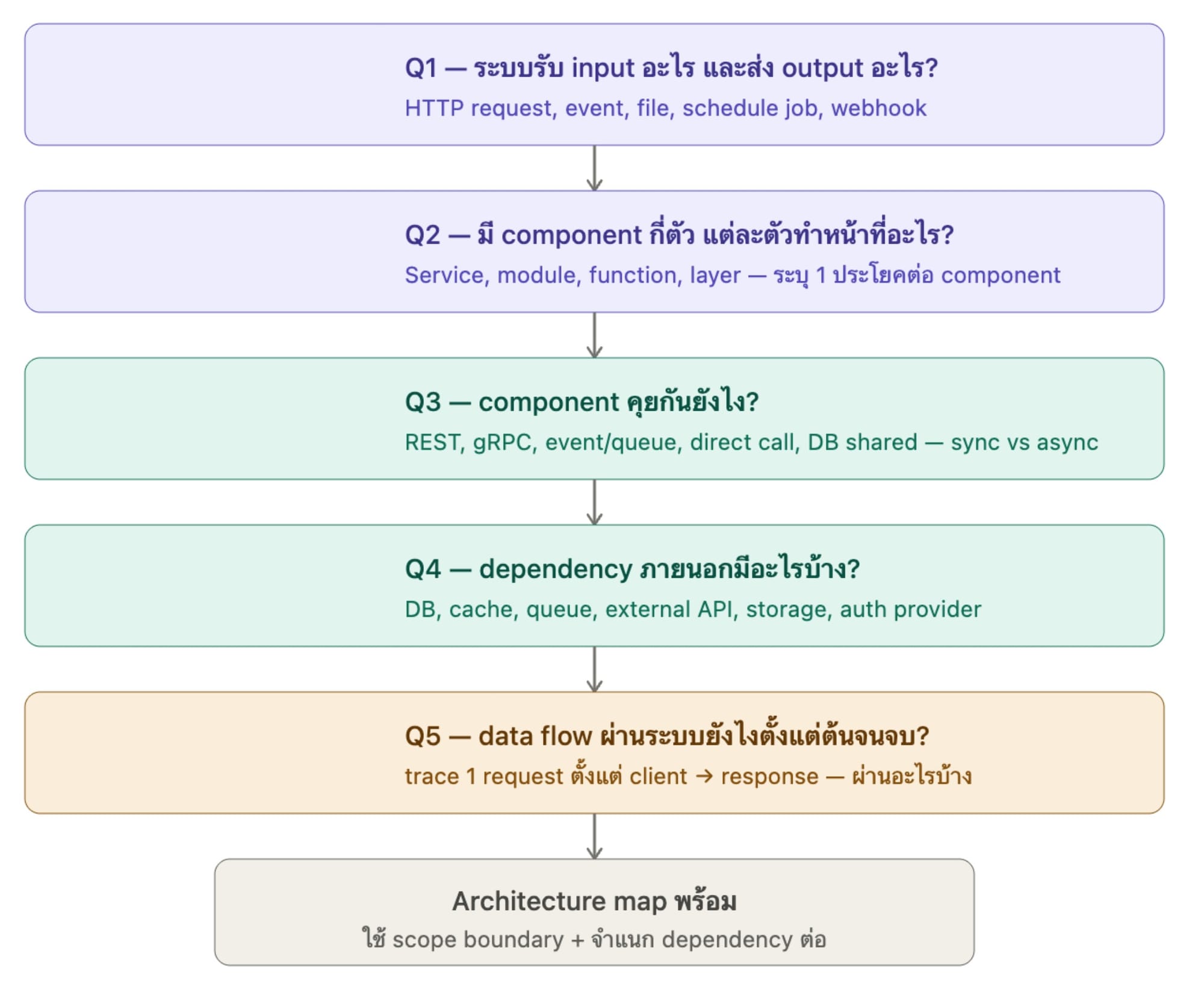 2. ไม่มีคนช่วย อ่านเอง: อ่าน codebase จาก entry point เช่น router.ts, main.py, App.java แล้วตาม import/dependency ออกไปเรื่อยๆ พร้อมกับอ่าน docker-compose.yml และ .env เพื่อดู infrastructure ที่ระบบต้องการ