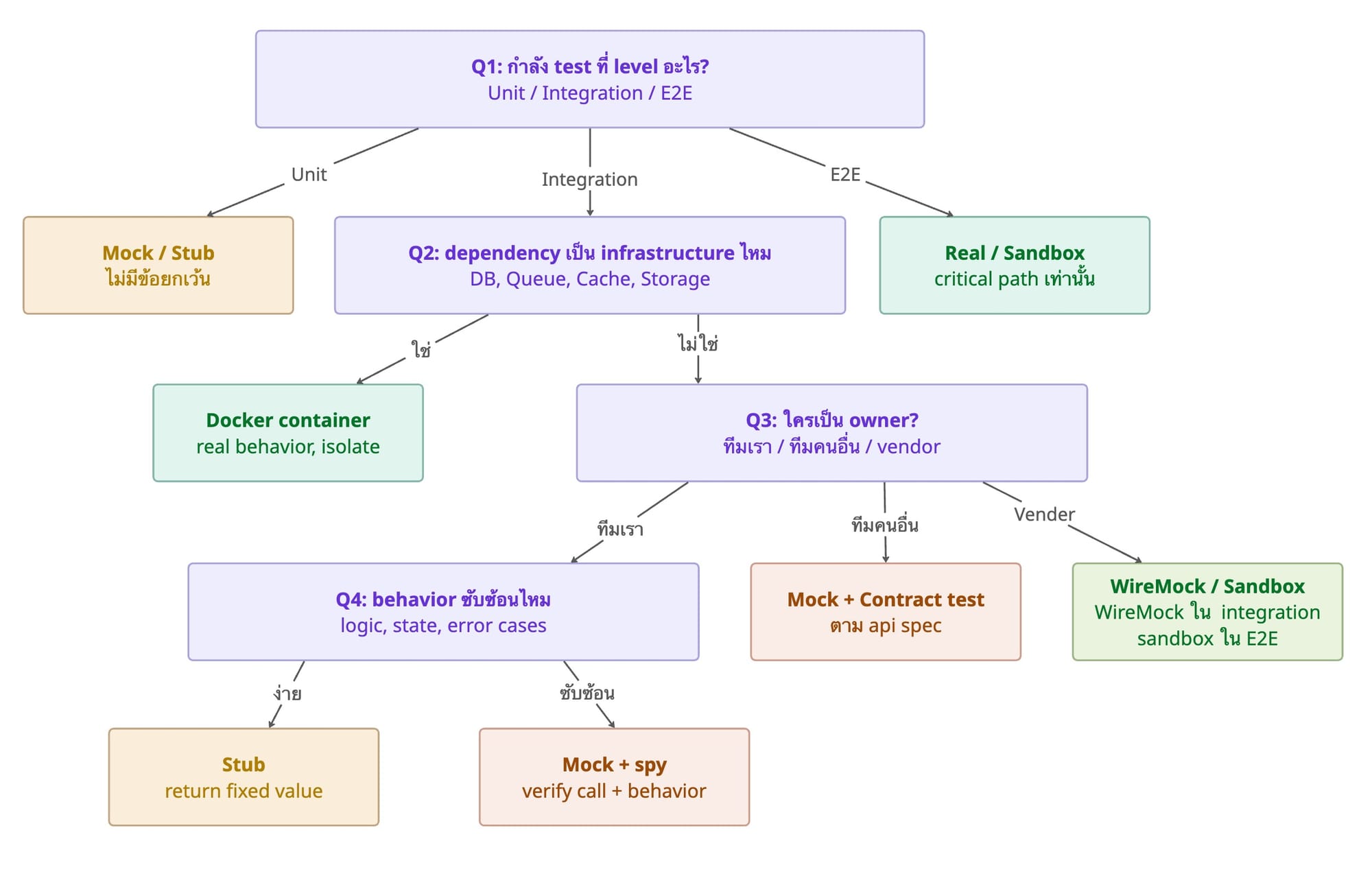 → ไม่ใช่ (external API) = WireMock / MSW / mock server
