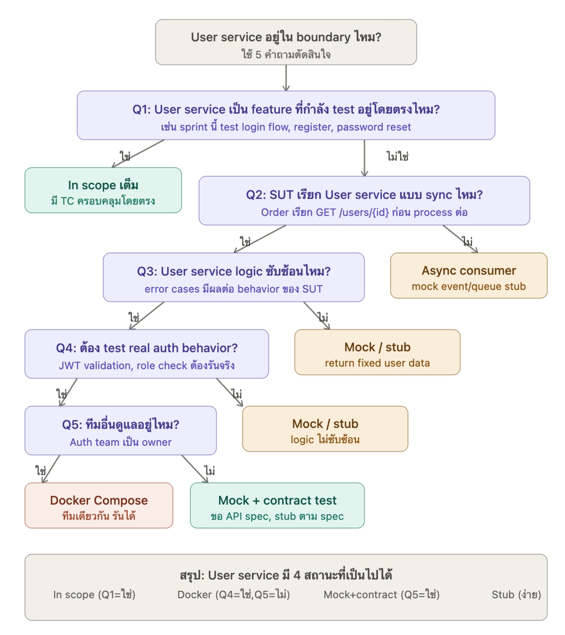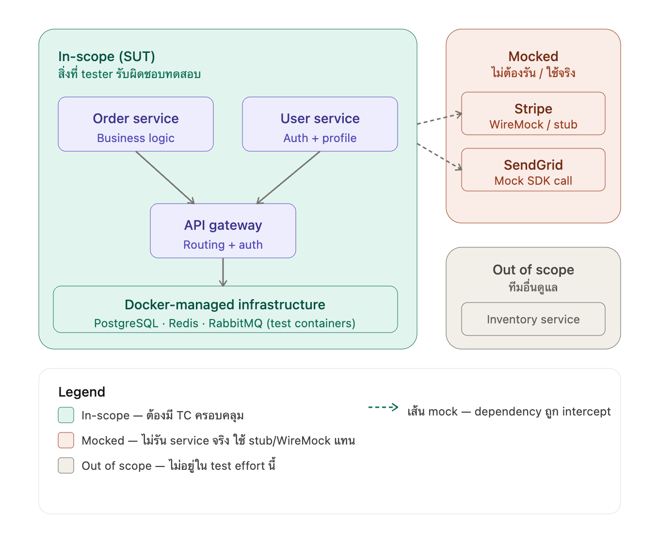 เมื่อ map เสร็จแล้ว ก็พร้อมไปขั้น 2: ขีด boundary ว่าอะไร in-scope อะไร out-of-scope และอะไรควร mock