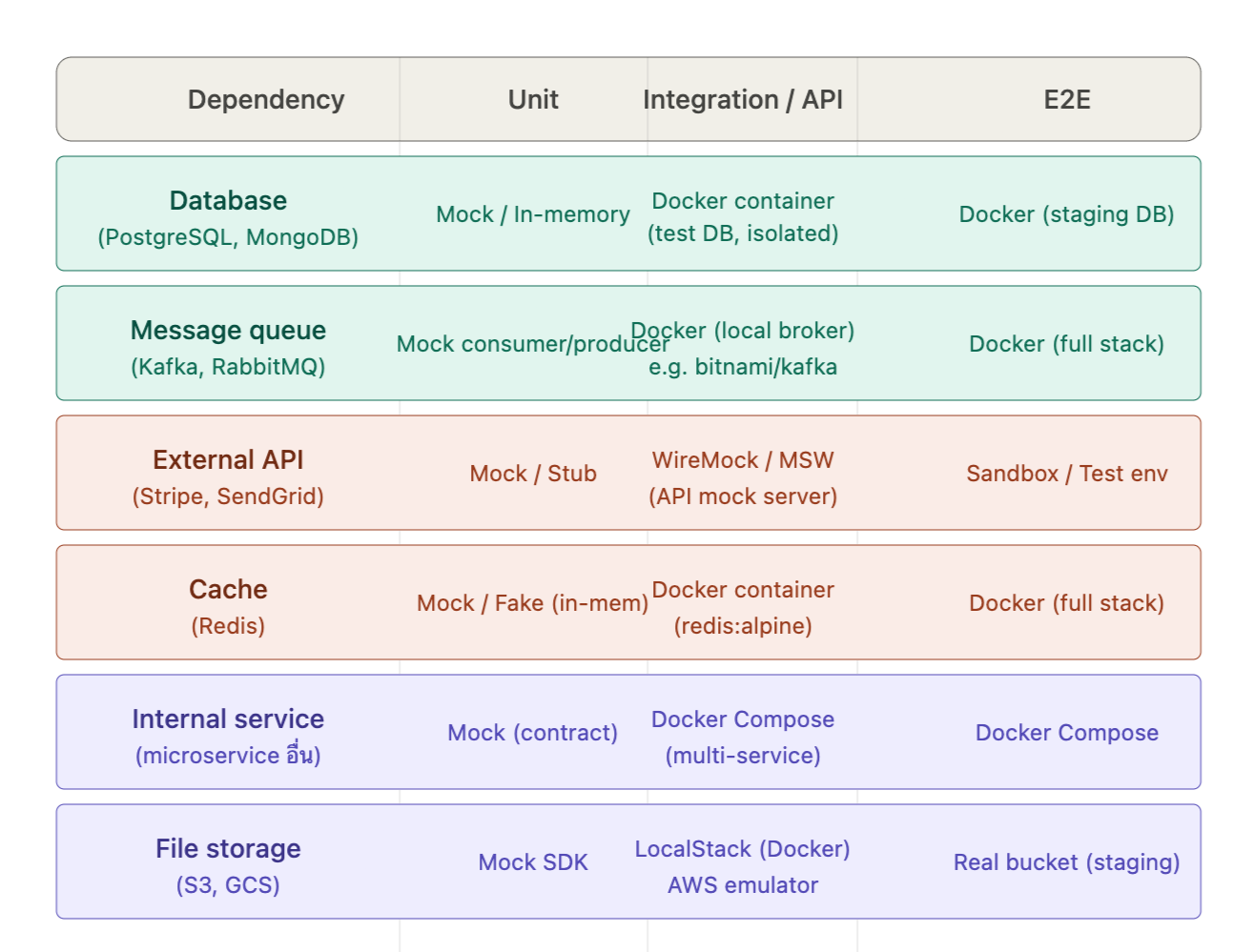 - Integration → Docker สำหรับ infra, mock สำหรับ external