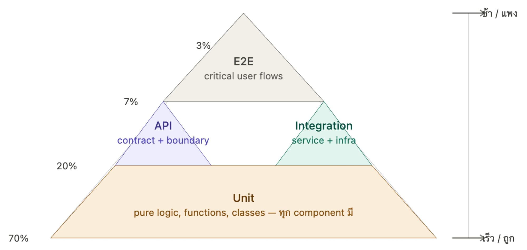 จากตัวอย่าง ตัวเลข 70/20/7/3 ไม่ใช่กฎตายตัว เป็นแนวทางที่ทำให้ suite เร็ว เชื่อถือได้ และดูแลง่าย ในระบบที่ heavy integration อาจเป็น 50/40/7/3 ก็ได้